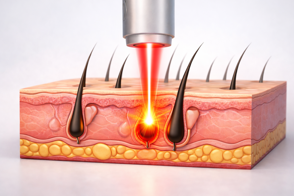 Laser hair removal is a non-invasive cosmetic procedure that uses concentrated light energy to target hair follicles beneath the skin. The laser emits a specific wavelength of light that is absorbed by melanin (the pigment) in the hair shaft. This light energy converts to heat, damaging the follicle and significantly slowing or preventing future hair growth.